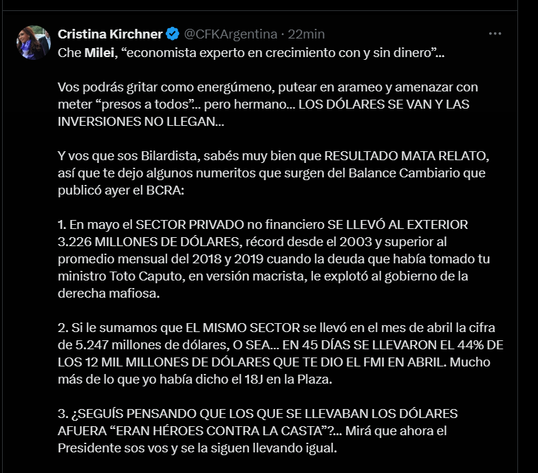 “Che Milei, ‘economista experto en crecimiento con y sin dinero’… Vos podrás gritar como energúmeno, putear en arameo y amenazar con meter presos a todos… pero hermano… los dólares se van y las inversiones no llegan”, escribió CFK en el arranque del mensaje que rápidamente se viralizó.