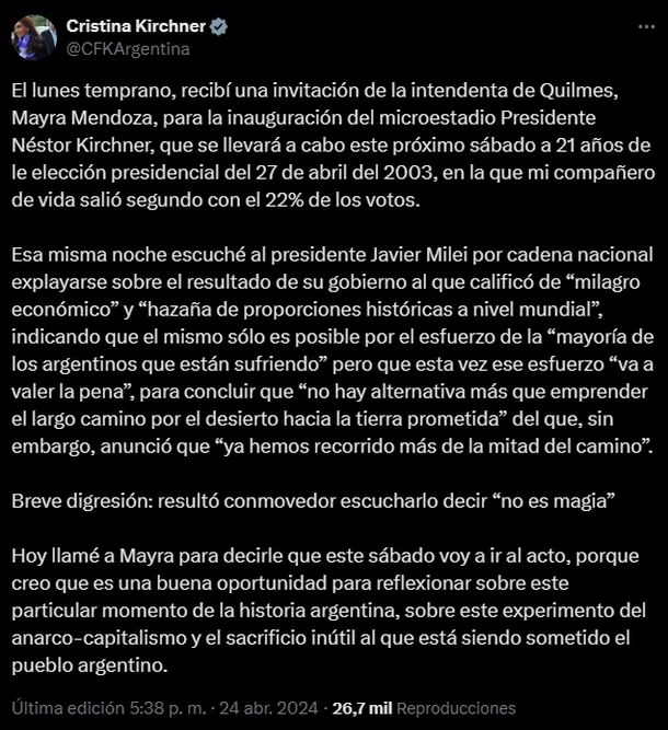 Inmediatamente, agregó: «Breve digresión: resultó conmovedor escucharlo decir ‘no es magia'», apuntando contra el actual primer mandatario. «Hoy llamé a Mayra para decirle que este sábado voy a ir al acto, porque creo que es una buena oportunidad para reflexionar sobre este particular momento de la historia argentina, sobre este experimento del anarco-capitalismo y el sacrificio inútil al que está siendo sometido el pueblo argentino», concluyó.