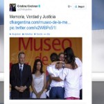 «Memoria, Verdad y Justicia», son las únicas palabras que aparecen en el mensaje publicado por la Presidente en su cuenta de Twitter, a la vez que incluyó una imagen tomada el 24 de marzo de 2004. en momentos en que el entonces presidente Néstor Kirchner dejada asentado que en el predio donde funcionara la ESMA se instalaría el Museo de la Memoria.