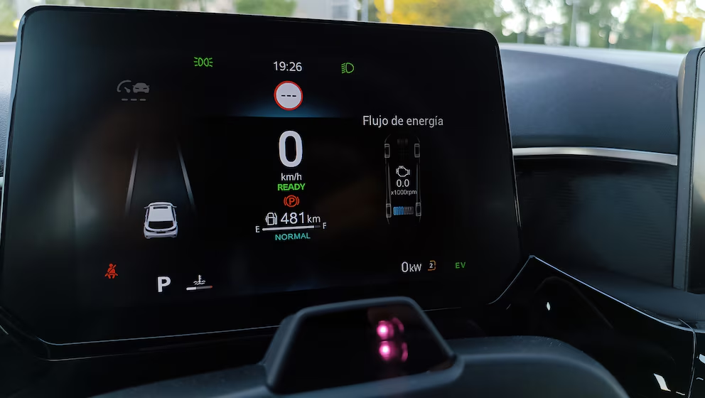 En el cuadro de instrumentos se puede verificar el modo de uso y los momentos en los que el motor térmico está funcionando, ya que una notificación alterna las siglas EV y HEV (eléctrico e híbrido) mientras se muestra el flujo de energía y la carga actual de la batería.