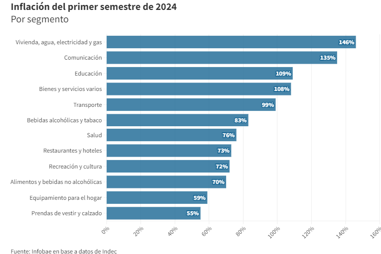 De acuerdo a lo informado por el Instituto Nacional de Estadísticas y Censos, la suba más pronunciada se produjo en el rubro “Vivienda, agua, electricidad y otros combustibles”, que registró un incremento del 146,7% en los primeros seis meses del año. Dentro de ese ítem se computan los alquileres y todas las subas de los servicios públicos, tanto por incrementos de tarifas como por quita de subsidios.