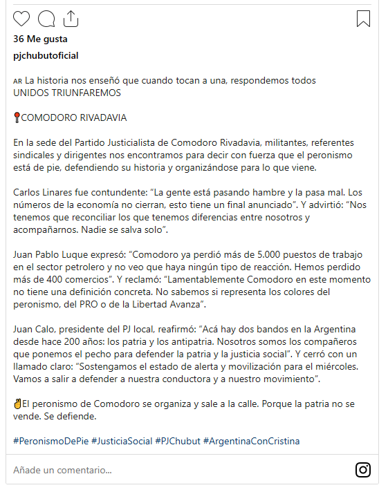 Este viernes, en la sede del Partido Justicialista de Comodoro Rivadavia, se congregaron militantes, referentes sindicales y dirigentes políticos para expresar una postura unificada frente al complejo escenario nacional y convocar a la movilización del próximo miércoles, en acompañamiento a Cristina Fernández de Kirchner, quien comprometió su presencia en Comodoro Py.
