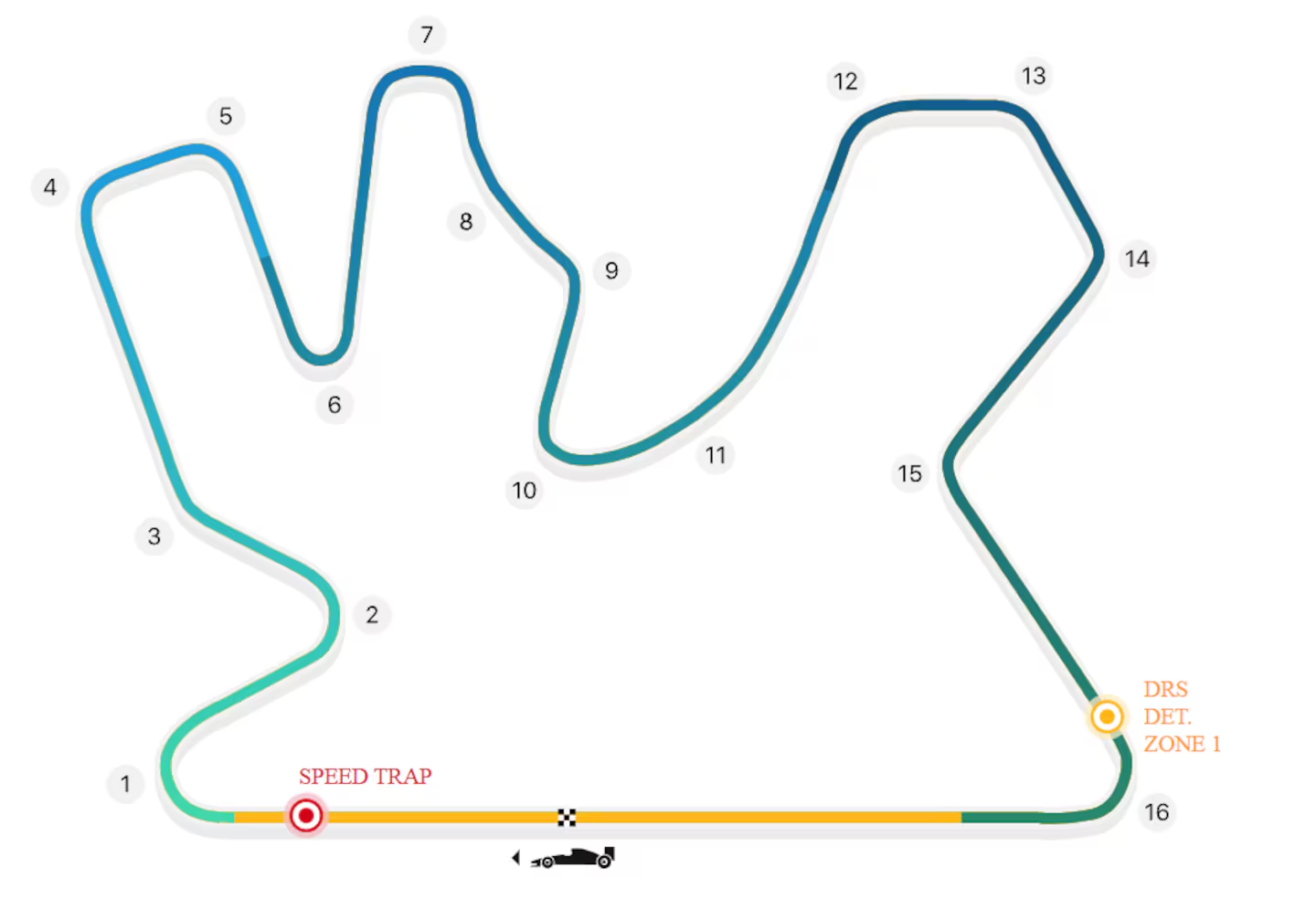 El trazado cuenta con un total de 16 curvas: 6 hacia la izquierda y 10 hacia la derecha. Entre las más notables se encuentran las curvas rápidas y fluidas del sector medio, que exigen precisión y equilibrio aerodinámico. Las curvas cerradas al inicio y al final del circuito demandan máxima tracción y precisión en la aceleración, mientras que las secciones sinuosas permiten demostrar el control del vehículo en transiciones rápidas. Este diseño, combinado con las condiciones del desierto circundante, plantea un desafío único que requiere un balance perfecto entre velocidad en rectas y estabilidad en las curvas.