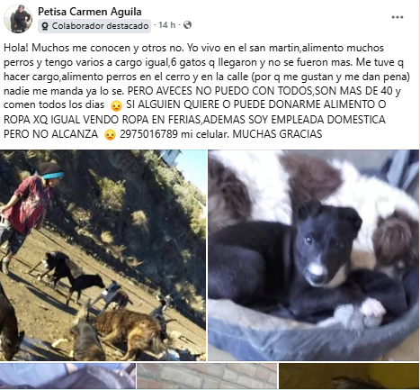 «Hola, muchos me conocen y otros no. Vivo en el barrio San Martín y alimento a muchos perros; además, tengo varios a mi cargo, así como seis gatos que llegaron y ya no se fueron más (…) Nadie me manda a hacerlo, ya lo sé, pero a veces no puedo con todos: son más de 40 y comen todos los días» explicó en redes.