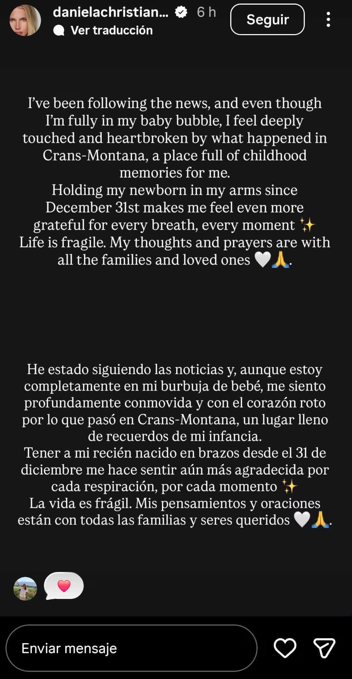 “He estado siguiendo las noticias y, aunque estoy completamente en mi burbuja de bebé, me siento profundamente conmovida y con el corazón roto por lo que pasó en Crans-Montana, un lugar lleno de recuerdos de mi infancia. Tener a mi recién nacido en brazos me hace sentir aún más agradecida por cada respiración, por cada momento”, escribió.