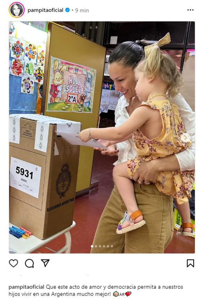 Pampitaestuvo acompañada de su hija Anita en la escuela a la que asistió para emitir su voto. “Que este acto de amor y democracia permita a nuestros hijos vivir en una Argentina mucho mejor”, comentó en la seguidilla de fotos en donde la vemos con un jean marrón y una camisa blanca llevando a su pequeña a upa.