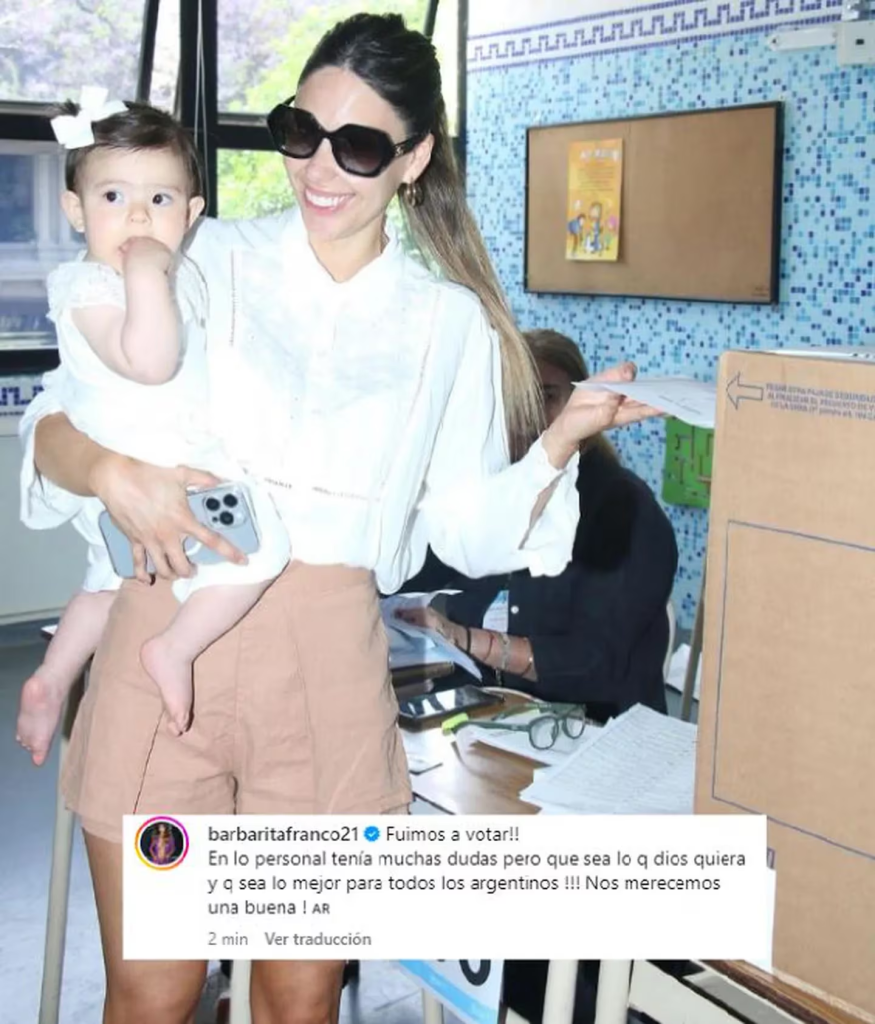 Barby Franco también estuvo acompañada de su hija Sarah Burlando. “¡Fuimos a votar! En lo personal tenía muchas dudas, pero que sea lo que dios quiera y que sea lo mejor para todos los argentinos. ¡Nos merecemos una buena!”, escribió la modelo en sus redes.