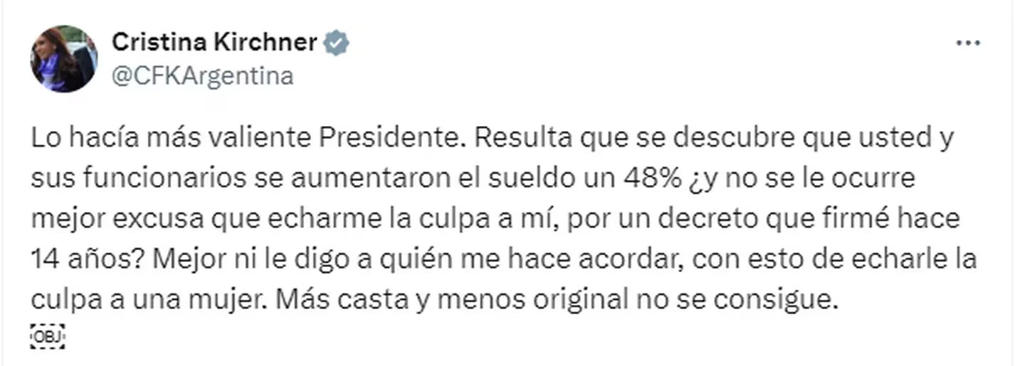 Minutos más tarde, Cristina Kirchner recurrió a la misma plataforma para cruzarlo: “Lo hacía más valiente Presidente. Resulta que se descubre que usted y sus funcionarios se aumentaron el sueldo un 48% ¿y no se le ocurre mejor excusa que echarme la culpa a mí, por un decreto que firmé hace 14 años? Mejor ni le digo a quién me hace acordar, con esto de echarle la culpa a una mujer. Más casta y menos original no se consigue”.