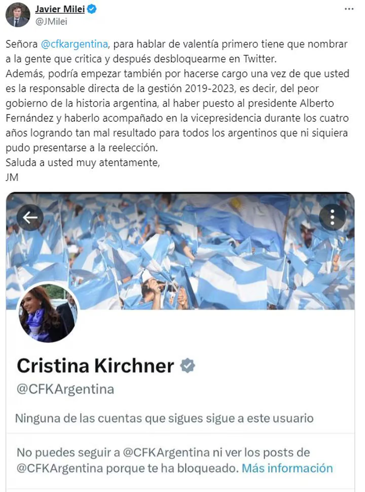 “Señora Cristina Kirchner, para hablar de valentía, primero tiene que nombrar a la gente que critica y después desbloquearme en Twitter”, escribió el Presidente adjuntando la captura donde mostraba que su usuario había sido bloqueado por la exmandataria.