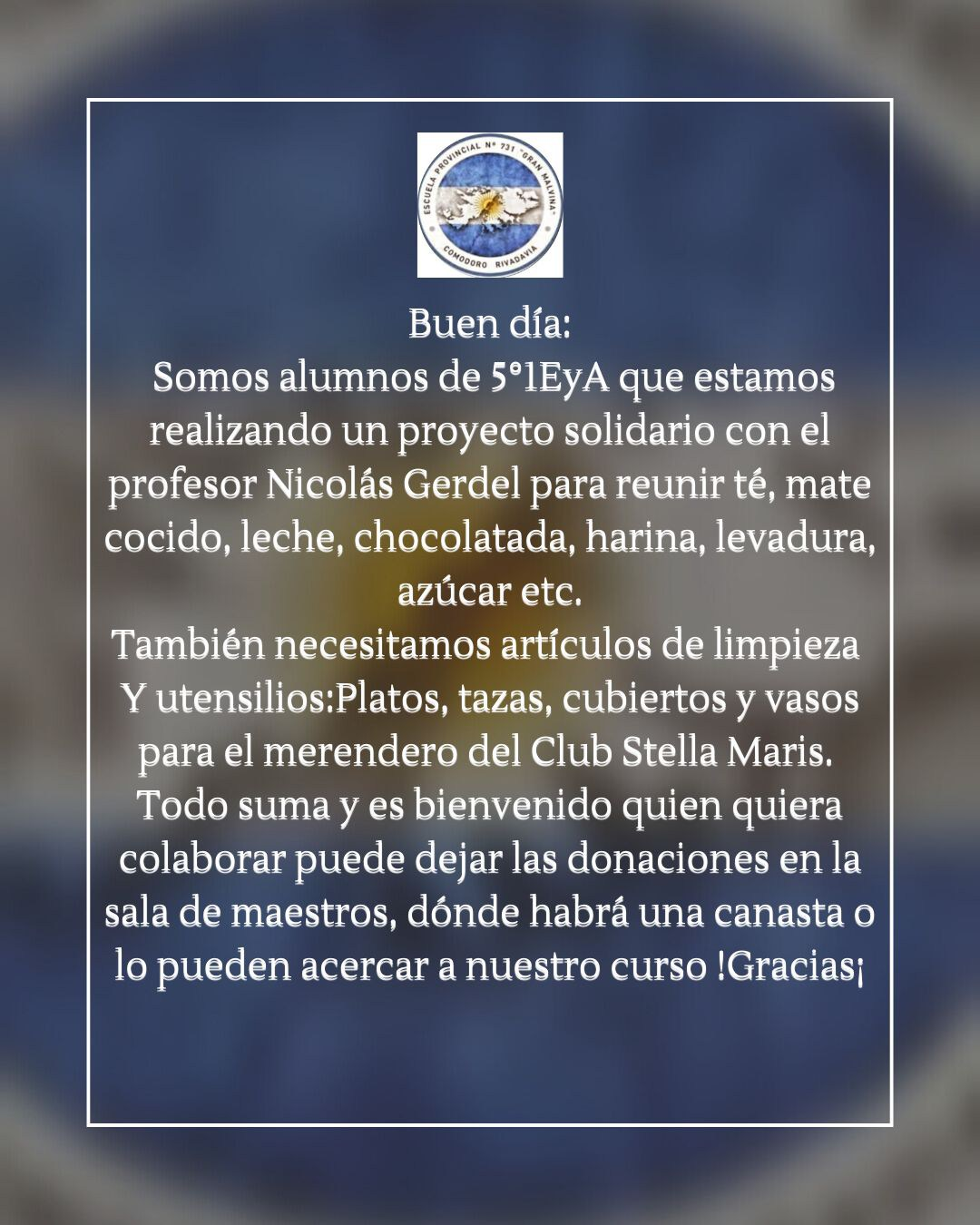 Los estudiantes de quinto año 1EyA de la Escuela Provincial N° 731 «Gran Malvina» están llevando adelante un proyecto solidario junto con el profesor Nicolás Gerdel. El objetivo es recolectar alimentos básicos como té, mate cocido, leche, chocolatada, harina, levadura, azúcar, entre otros, para colaborar con el merendero del Club Stella Maris.