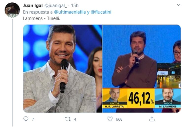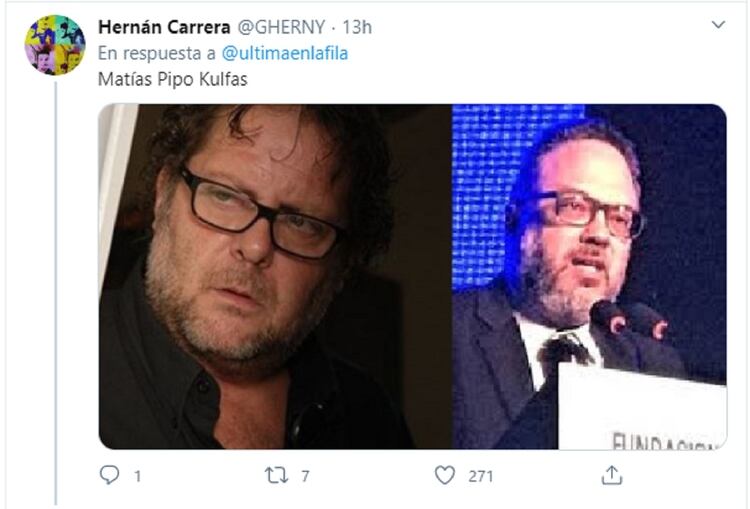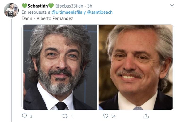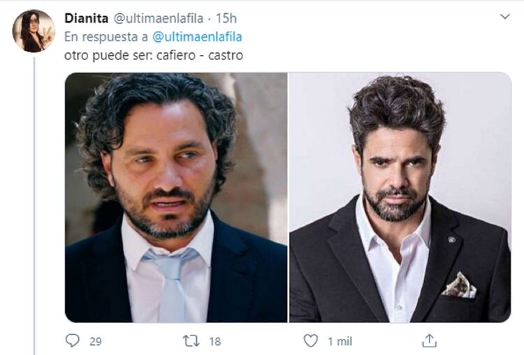 Danita, la ideología de este desafío, arrancó con “el más obvio”, según escribió ella misma en la publicación: Eduardo “Wado” De Pedro (Ministro del Interior) podría ser interpretado por Estebán Lamothe, y luego continuó otros nombres de actrices y actores que, por su parecido, podrían interpretar a los principales referentes de la política local. Enseguida, su iniciativa comenzó a replicarse en dicha red social, donde logró más de 600 retuits y cientos de comentarios.
