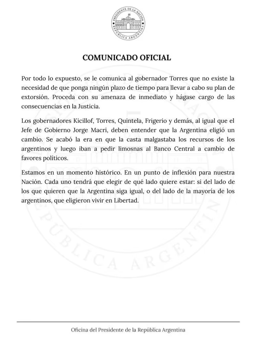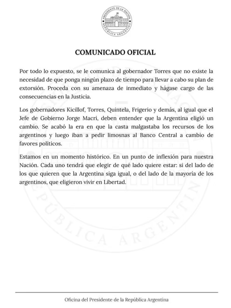 “Por todo lo expuesto, se le comunica al gobernador Torres que no existe la necesidad de que ponga ningún plazo de tiempo para llevar a cabo su plan de extorsión. Proceda con su amenaza de inmediato y hágase cargo de las consecuencias en la Justicia”, fue la desafiante respuesta del Gobierno.