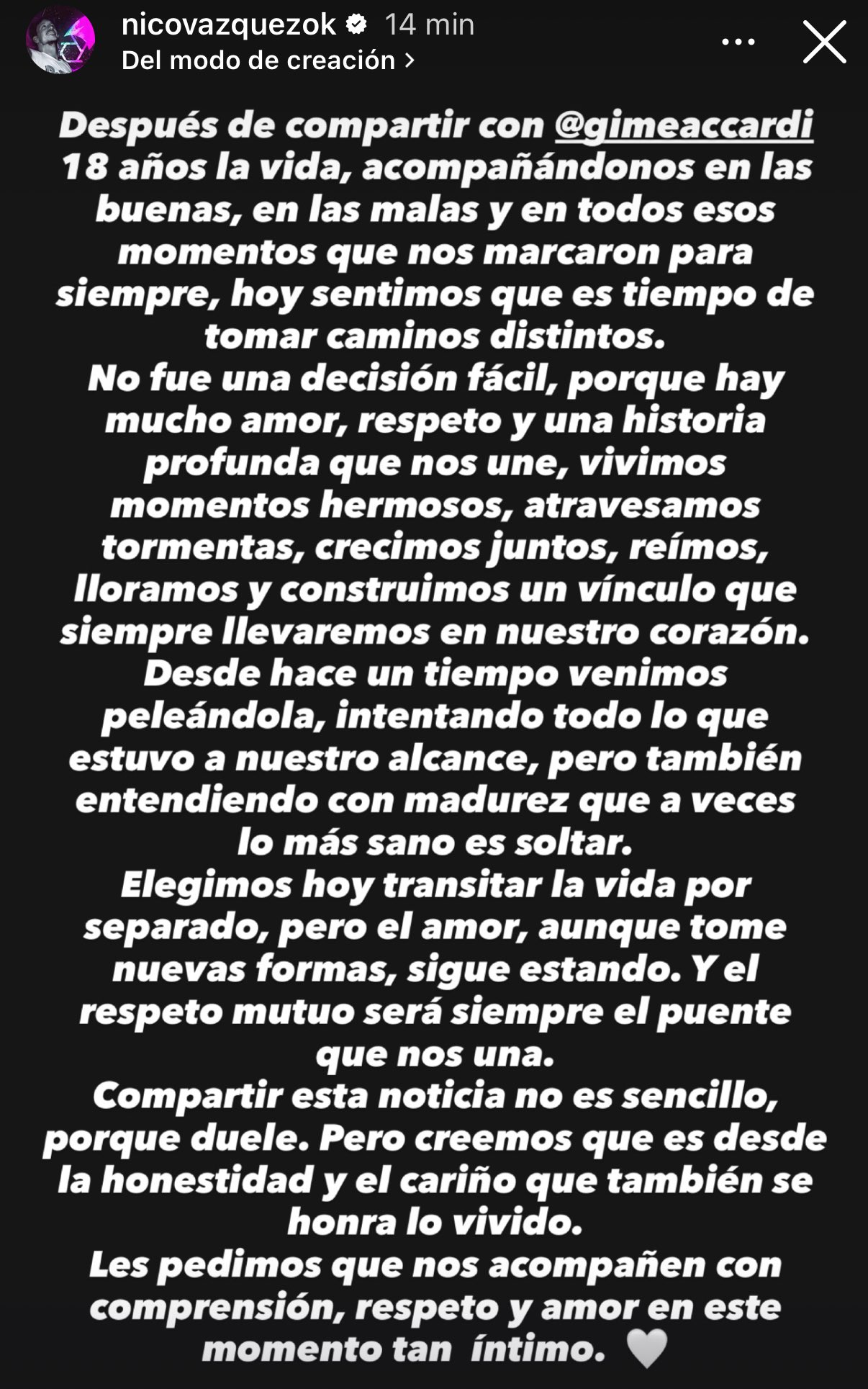 Luego de 18 años de relación, los actores Nicolás Vázquez y Gimena Accardi anunciaron su separación en las redes sociales.