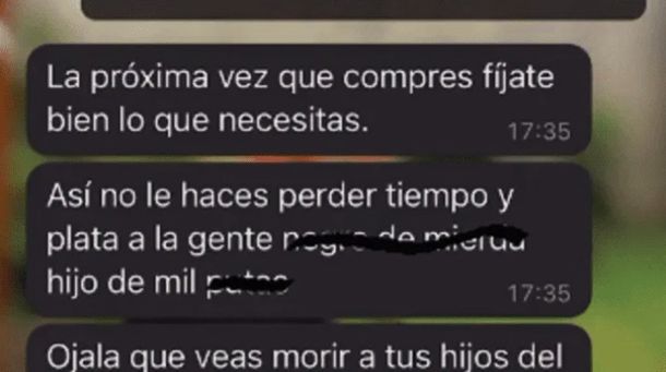 La captura muestra que el vendedor le escribió: “La próxima vez que compres fijate bien lo que necesitas” y luego agregó en forma violenta: “Así no le hacés perder tiempo y plata a la gente, negro de mier… hijo de mil put…”.