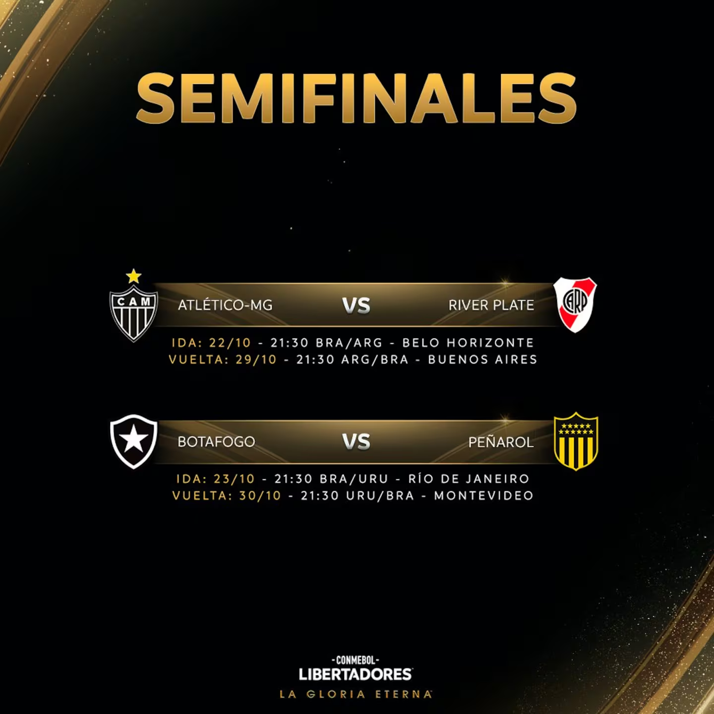 Este viernes la Conmebol los confirmó días y horarios para los cruces de semifinales de la Copa Libertadores 2024. River chocará con Atlético Mineiro, mientras que Botafogo se medirá ante Peñarol.