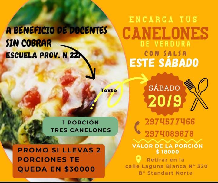 Los canelones serán de verdura con salsa y se ofrecerán en porciones de tres unidades a un valor de $18.000. Además, habrá una promoción especial: dos porciones a $30.000. Los pedidos se reciben a través de los números 297-4577466 y 297-4089678.