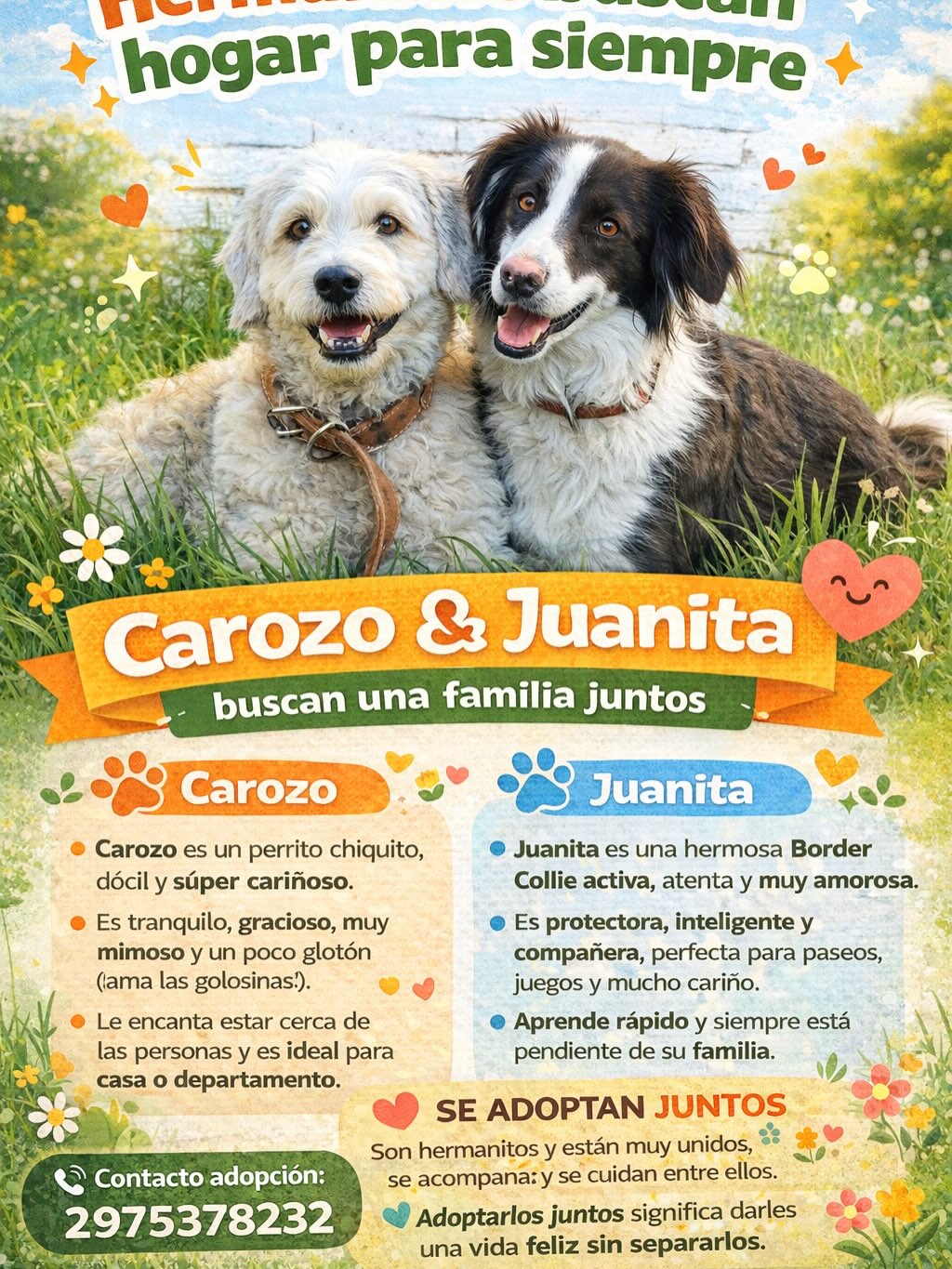 Carozo es un perrito chiquito, dócil y muy cariñoso. Es tranquilo, mimoso y se adapta perfectamente a una casa o departamento. Juanita, en tanto, es una Border Collie activa, inteligente y amorosa, ideal para paseos y juegos, siempre atenta a su familia.