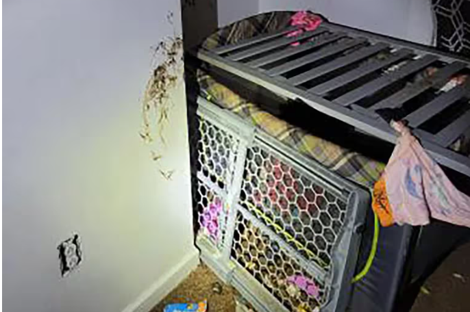 La “jaula improvisada” había sido construida con un corral y una pieza de cuna, amarrada en tres lados para evitar cualquier intento de escape.