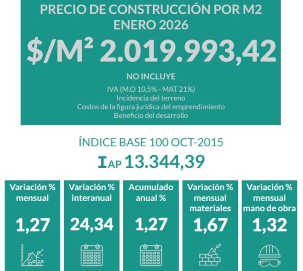 Según el último informe mensual de la Asociación de Pymes de la Construcción de la Provincia de Buenos Aires (APYMECO), correspondiente a enero de 2026, el precio del m2 alcanzó los $2.019.993,42 más IVA y sin incluir incidencia del terreno, costos financieros ni beneficio del desarrollador