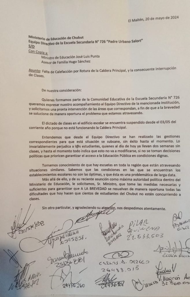Finalmente, la madre de la alumna de la Escuela N° 726 de El Maitén, concluyó que “ayer a la tarde mientras los docentes estaban en la única aula que tiene calefacción, hubo una pequeña explosión por el trabajo de los calderistas. Nos parece que los que está sucediendo es tremendo porque tiene consecuencias graves tanto para los trabajadores como para los chicos”.