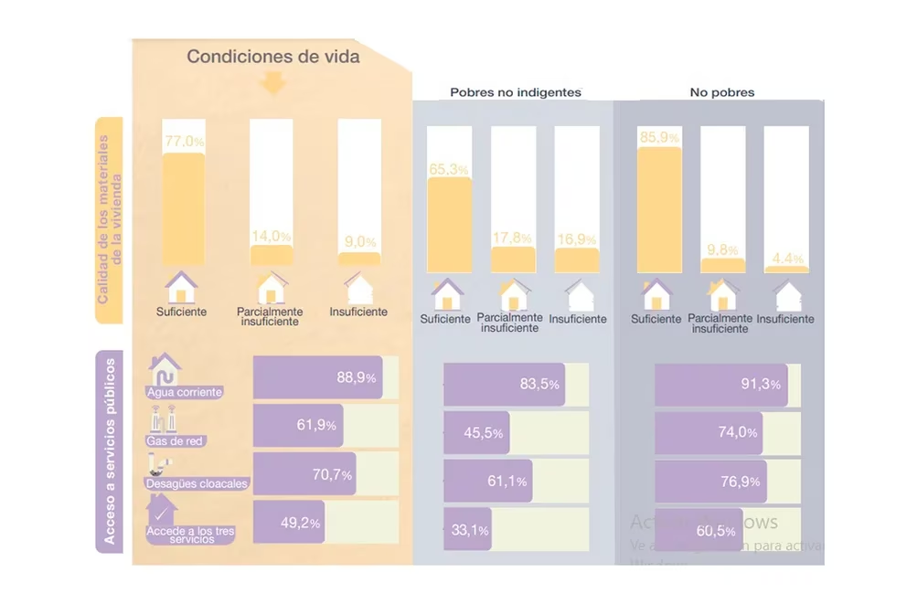 En el que menos dificultades hay es en el agua corriente, ya que el 91,3% de las viviendas “no pobres” tienen acceso a las redes de agua. La situación es más crítica en lo que respecta al servicio eléctrico -hay un 23,1% de los hogares que no tienen luz- y el acceso al gas -26% no tiene conexión-.