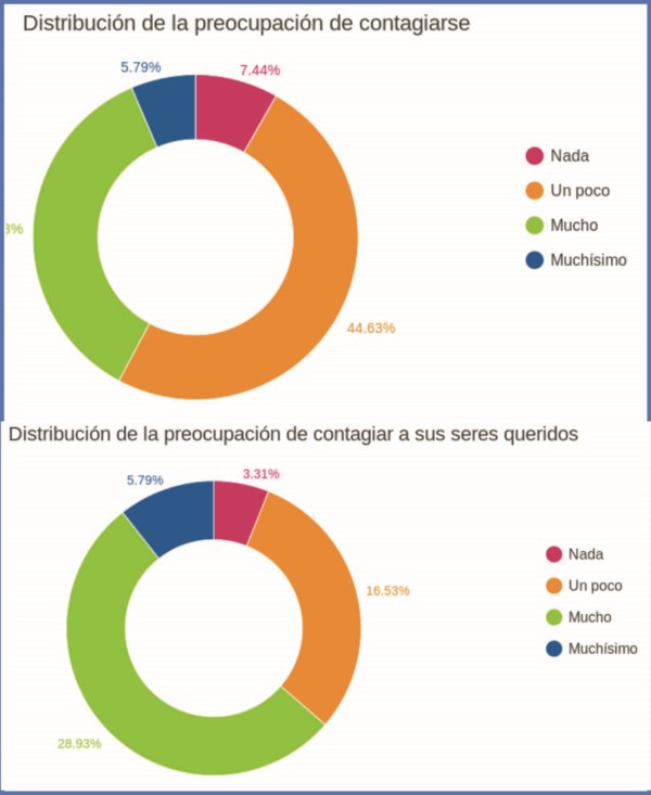 En la encuesta se evaluó también el miedo a contagiarse y contagiar a seres queridos. En lo referente al temor del contagio propio, el 15.70% de las personas encuestadas respondieron que el temor era muchísimo, el 32.23% que el temor era mucho, mientras que el 44.63% manifestó que le 13 preocupaba poco y 7.44% nada. El miedo aumentó cuando se preguntó sobre el temor de contagiar a sus seres queridos: el 51.24% respondieron que era muchísimo, el 28.93% era mucho, 16.53% poco y el 3.31% nada.