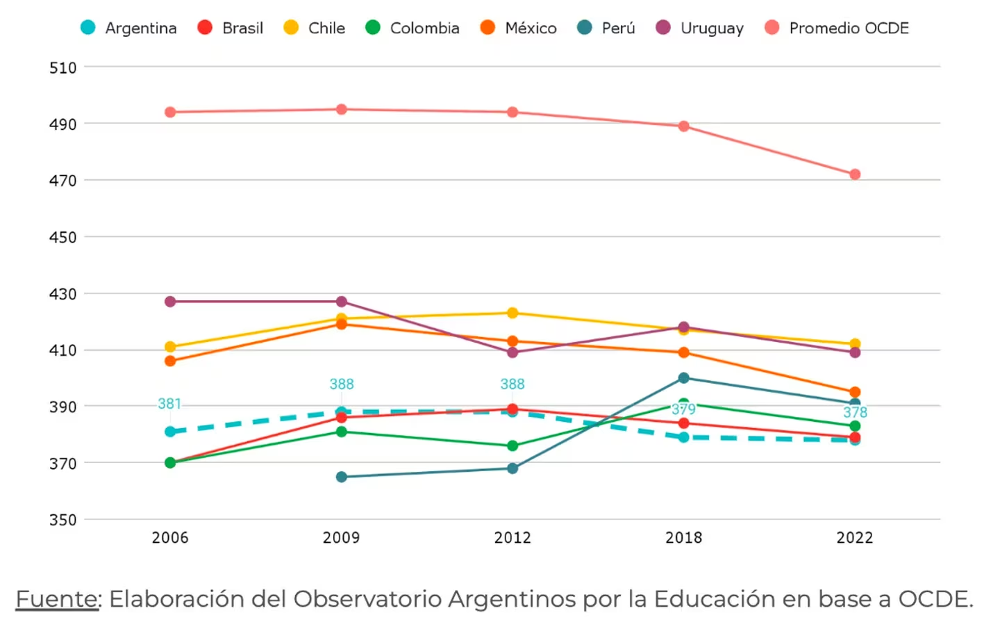 Y este tipo de falencias se ven reflejadas en los resultados de la Argentina en pruebas internacionales. En PISA 2022 los estudiantes argentinos obtuvieron 378 puntos en Matemática, un punto menos que en la edición previa (2018) y casi 100 puntos menos de lo que obtienen, en promedio, los países que integran la Organización para la Cooperación y el Desarrollo Económicos (472). Esa cifra ubicó a la Argentina en el puesto 66 de 81 países. Los datos fueron compartidos por Argentinos por la Educación.