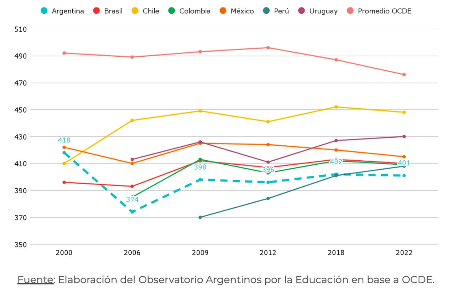 En Lectura, Argentina pasó de 402 puntos en 2018 a 401 en 2022, y quedó debajo de Chile (448), Uruguay (430), Costa Rica (415), México (415), Brasil (410), Colombia (409) y Perú (408). Se ubica en el puesto 58° sobre 81 participantes. El 54,4% de los estudiantes está por debajo del nivel mínimo.