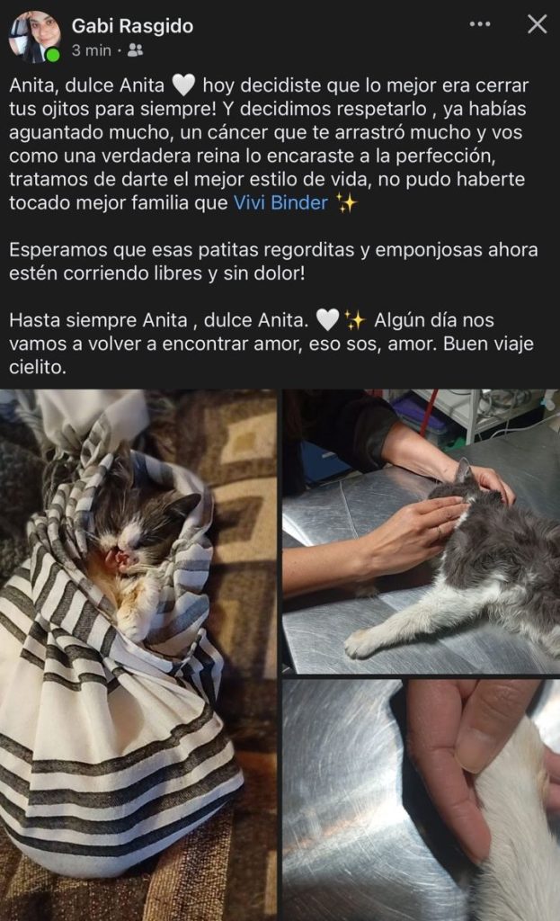 Los mensajes también transmitieron esperanza y cariño hacia la gatita: «Esperamos que esas patitas regorditas y emponjosas ahora estén corriendo libres y sin dolor. Hasta siempre Anita, dulce Anita. Algún día nos vamos a volver a encontrar, amor. Eso sos, amor. Buen viaje, cielito».