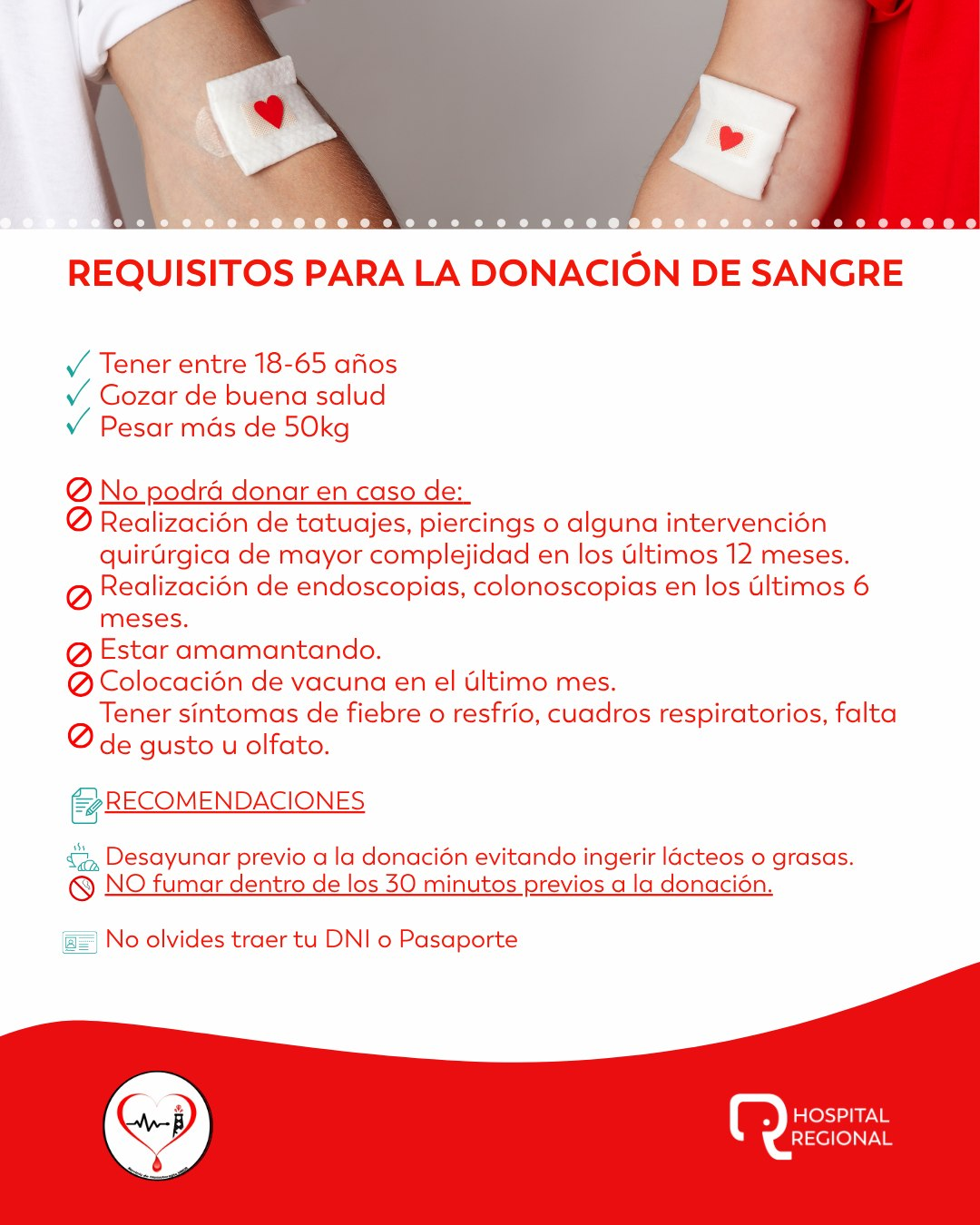 Los donantes interesados pueden acudir al Hospital Regional, ubicado en Av. Hipólito Yrigoyen 950, para colaborar.