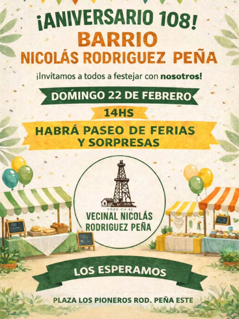 La Vecinal Nicolás Rodríguez Peña anunció los festejos por el 108° aniversario del barrio, que se realizarán el domingo 22 de febrero a partir de las 14 horas.
