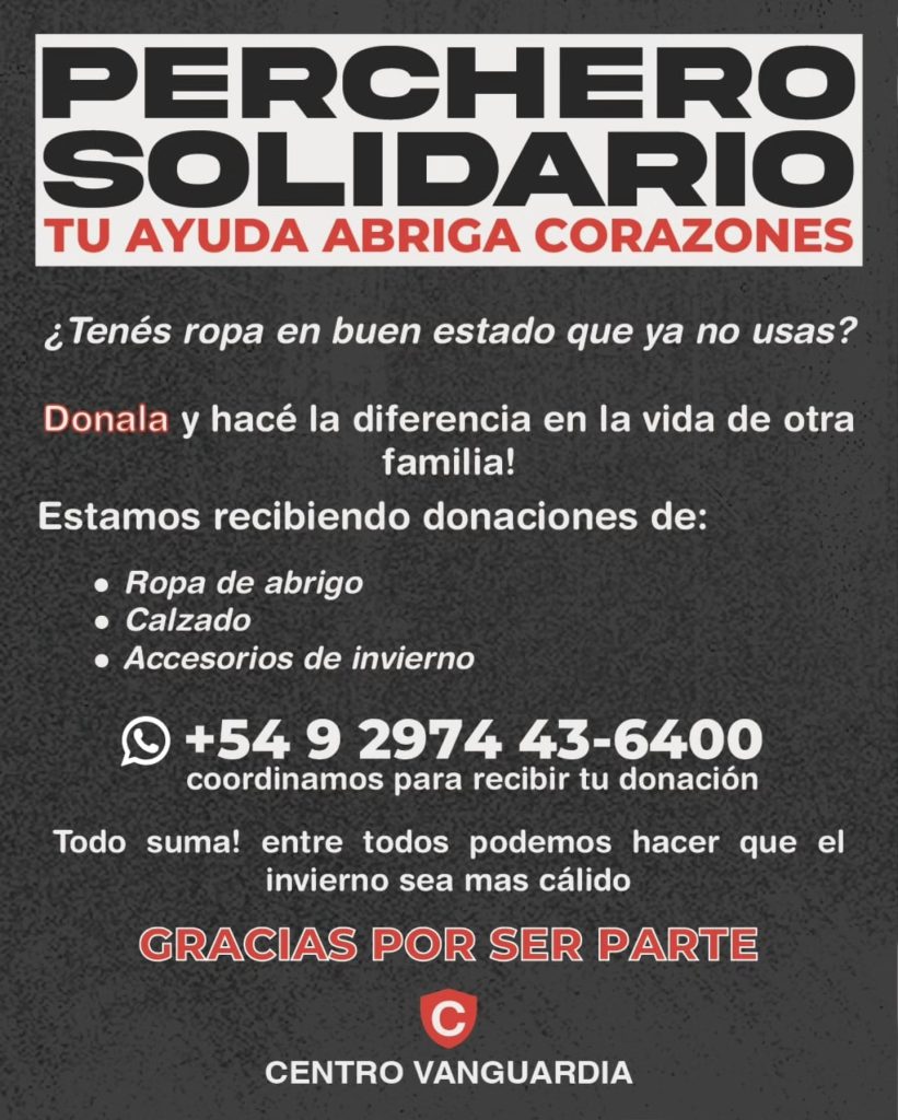El Centro Vanguardia puso en marcha una nueva campaña solidaria para reforzar el Perchero Solidario, una iniciativa que ya funciona desde hace tiempo en Comodoro Rivadavia y que brinda abrigo a personas en situación de vulnerabilidad.