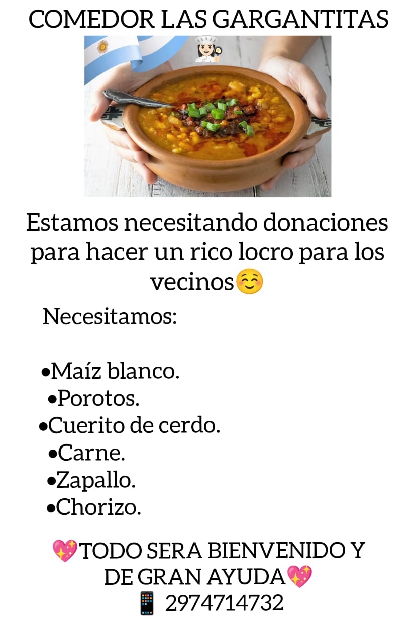 Actualmente requieren: maíz blanco, porotos, cuerito de cerdo, carne, zapallo y chorizo. Las donaciones pueden entregarse coordinando primero con la encargada, cuyo contacto es 2974714732.
