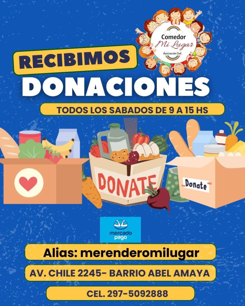 El Comedor Mi Lugar, ubicado en Av. Chile 2245 del barrio Abel Amaya, invita a toda la comunidad a sumarse con donaciones para seguir ayudando a quienes más lo necesitan. Reciben alimentos, productos básicos y cualquier aporte que pueda colaborar con su labor solidaria.