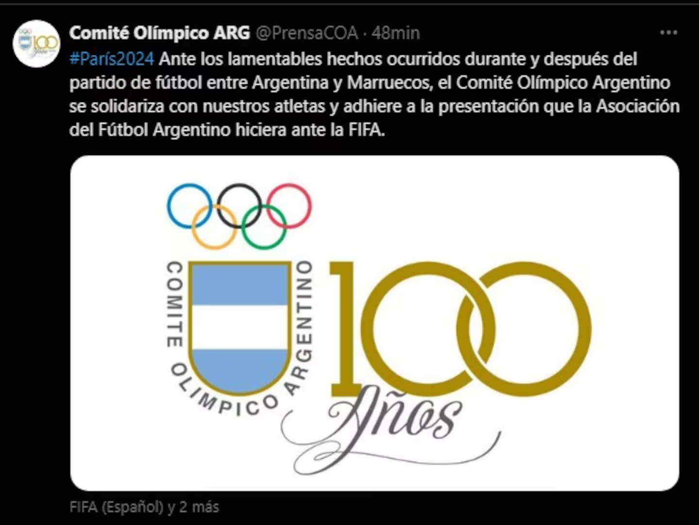 “Ante los lamentables hechos ocurridos durante y después del partido de fútbol entre Argentina y Marruecos, el Comité Olímpico Argentino se solidariza con nuestros atletas y adhiere a la presentación que la Asociación del Fútbol Argentino hiciera ante la FIFA”, expresaron a través de un escrito en las redes sociales.