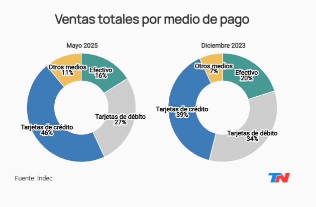 En base a datos oficiales del INDEC, el Centro RA de la Facultad de Ciencias Económicas de la UBA relevó que la modalidad de pago con plásticos representó el 46% del total de compras en los supermercados. Es un alza de 7 puntos porcentuales en la gestión Milei: en diciembre de 2023, los consumos con tarjeta de crédito en los súper llegaban al 39%. En ese mismo lapso, el uso de tarjetas de débito retrocedió del 34% al 27%, mientras los pagos en efectivo cayeron del 20% al 16%.
