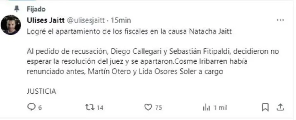 “Logré el apartamiento de los fiscales en la causa de Natacha Jaitt. Al pedido de recusación, Diego Callegari y Sebastián Fitipaldi, decidieron no esperar la resolución del juez y se apartaron”, escribió Ulises en X.
