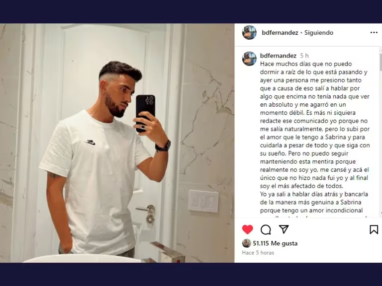 Sobre aquel posteo que luego borró, indicó: “Ni siquiera redacté ese comunicado yo porque no me salía naturalmente, pero lo subí por el amor que le tengo a Sabrina y para cuidarla a pesar de todo y que siga con su sueño”.