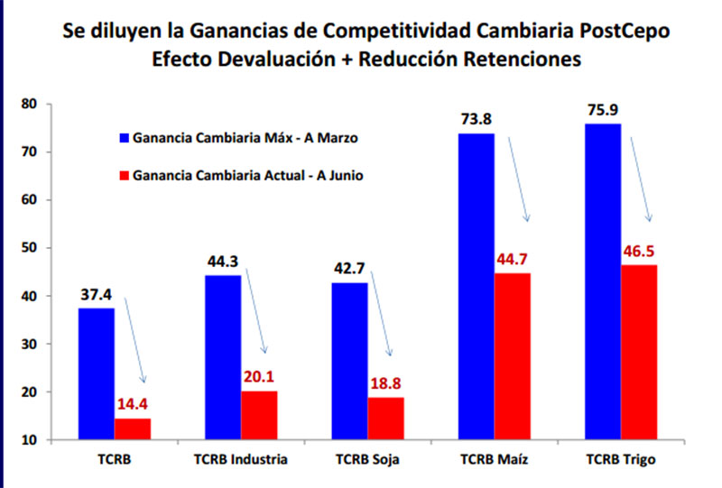 La salida del cepo cambiario no fue una definición de política cambiaria sino una táctica para conseguir la liquidación de stocks y una señal política de cambio que, hasta ahora, no se concretó en definiciones de tipo de cambio. FyEConsult explicó: «Como consecuencia de una tasa de inflación elevada y una política cambiaria con intervenciones acotadas, la competitividad cambiaria de la actividad productiva del país continuó deteriorándose desde que se estabilizó el mercado de cambios en marzo último, perdiendo gran parte de la mejora lograda desde la salida del cepo cambiario».