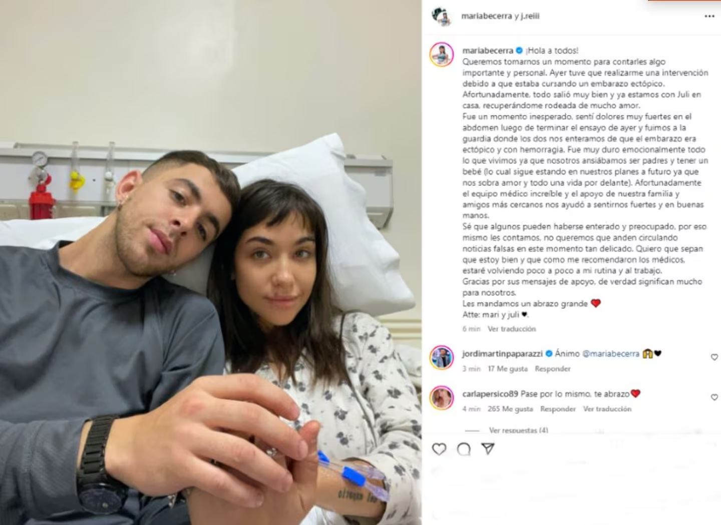 María Becerra preocupó a sus seguidores al compartir una foto junto a J Rei desde una clínica para contar que había perdido un embarazo. “¡Hola a todos! Queremos tomarnos un momento para contarles algo importante y personal. Ayer tuve que realizarme una intervención debido a que estaba cursando un embarazo ectópico. Afortunadamente, todo salió muy bien y ya estamos con Juli en casa, recuperándome rodeada de mucho amor”, explicó la cantante en su cuenta oficial de Instagram.
