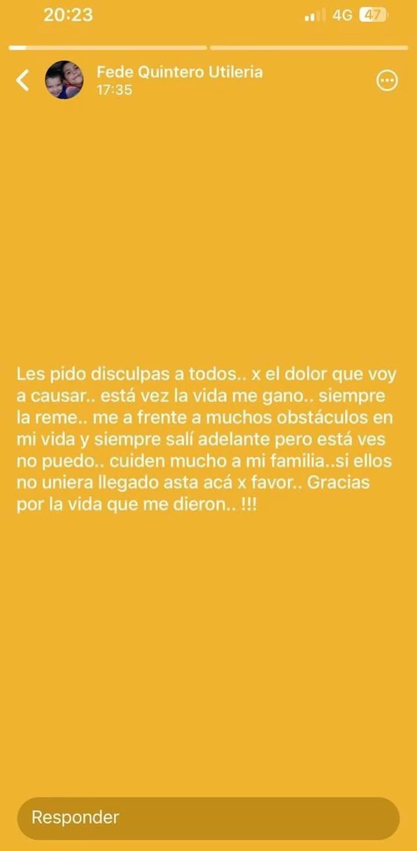 “Les pido disculpas a todos por el dolor que voy a causar. Esta vez la vida me ganó”, empezó diciendo Quinteros en un escrito que publicó en su estado de WhatsApp y luego agregó: “Siempre la remé, me enfrenté a muchos obstáculos en mi vida y siempre salí adelante, pero esta vez no puedo. Cuiden mucho a mi familia, sin ellos no hubiera llegado hasta acá, por favor. Gracias por la vida que me dieron”.