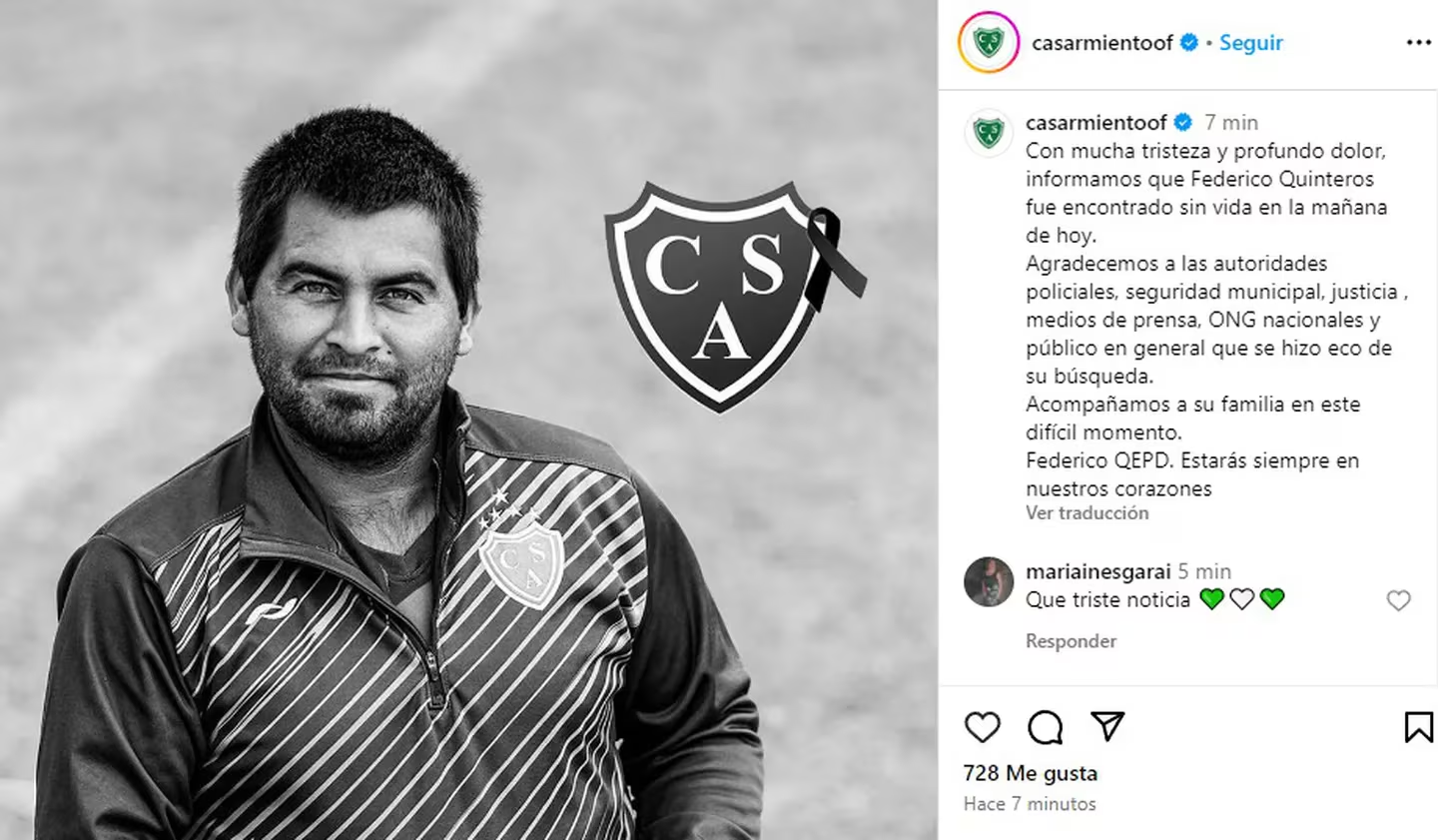 “Con mucha tristeza y profundo dolor, informamos que Federico Quinteros fue encontrado sin vida en la mañana de hoy. Agradecemos a las autoridades policiales, seguridad municipal, justicia, medios de prensa, ONG nacionales y público en general que se hizo eco de su búsqueda”, escribieron en las redes sociales oficiales del equipo de Junín y agregaron: “Acompañamos a su familia en este difícil momento. Federico QEPD. Estarás siempre en nuestros corazones”.