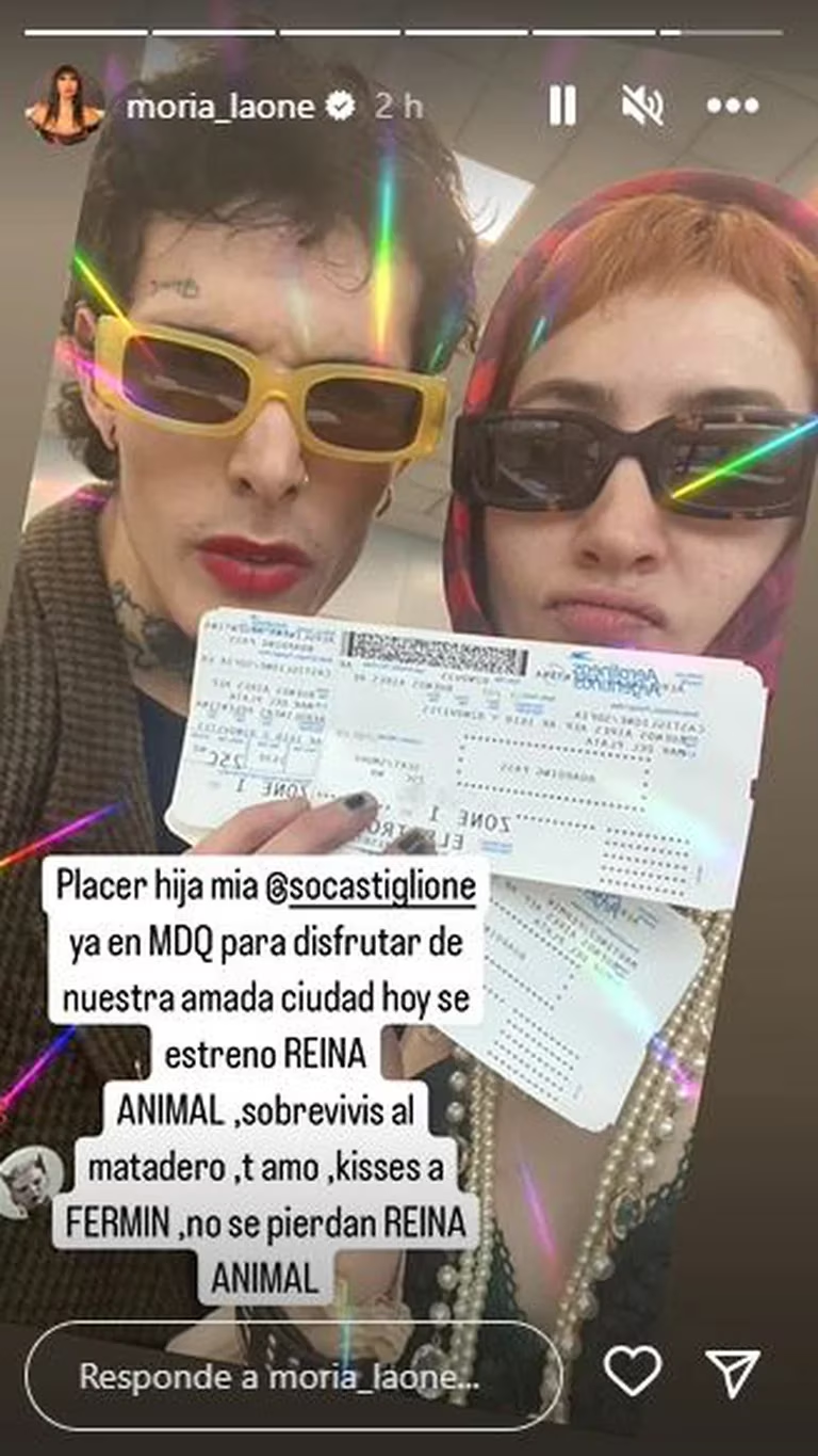 Luego, agregó una publicación más dedicada a su hija, que se tomó una selfie junto a un amigo, con quien muestra el pasaje antes de embarcar: “Placer, hija mía. Ya en MDQ para disfrutar de nuestra amada ciudad. Hoy se estrenó Reina Animal, sobrevivís al matadero. Te amo. Besos a Fermín. No se pierdan Reina Animal”, finalizó la diva.