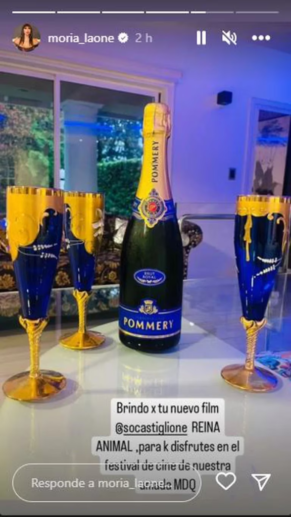 Lo hizo a través de sus Historias de Instagram: allí publicó diferentes fotos que su hija le había enviado por privado. “Brindo por tu nuevo film, Reina Animal, para que disfrutes en el Festival de Cine de nuestra amada MDQ (Mar del Plata)”, escribió La One en una primera imagen en la que se ve una botella de champagne francés y tres copas a su lado.