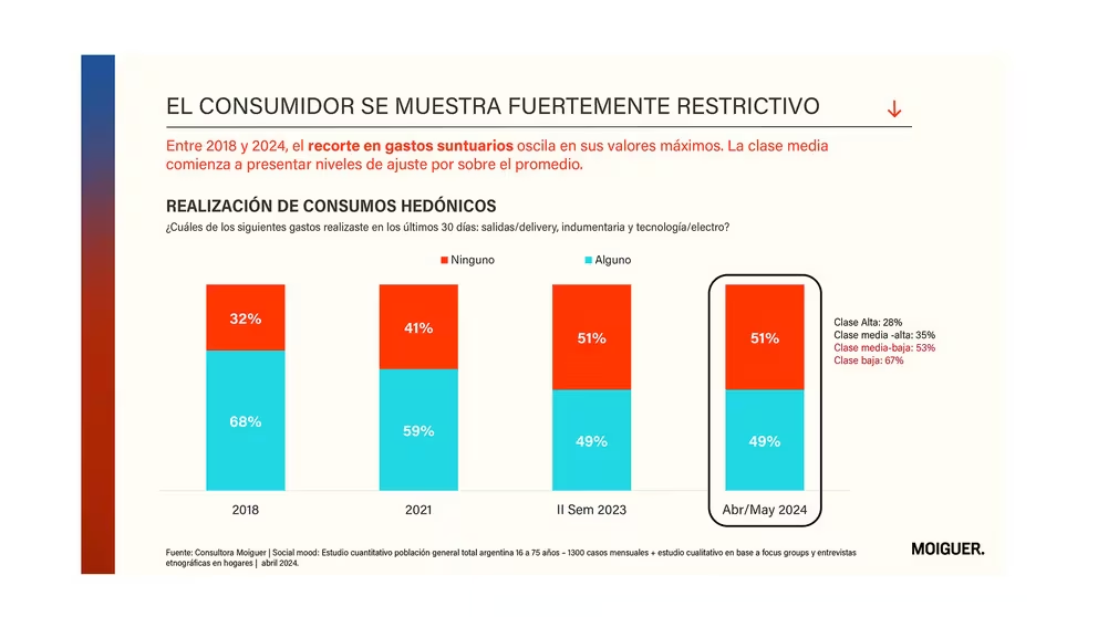 Y en particular muestra quiénes están haciendo los ajustes en materia de consumo. Según la encuesta, el 53% de las personas de clase media-baja y el 57% de clase baja afirmaron no haber realizado ningún consumo hedónico en los últimos 30 días, tales como salidas, compras de indumentaria, tecnología y electrodomésticos, o uso de servicios de delivery. Estos porcentajes superan el promedio general del 51%, que ya era el nivel registrado durante el último semestre de 2023 y se mantiene en el comienzo de este año.