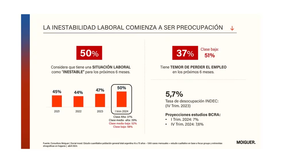 El contraste es nítido: mientras que el 43% de los encuestados señalaron que el 43% cree que el escenario general mejorará y el 41% que la inflación bajará, del otro lado el 52% prevé que la capacidad de compra continuará en un nivel bajo; el mismo porcentaje se observa ante la pregunta sobre el empeoramiento de la estabilidad laboral personal.