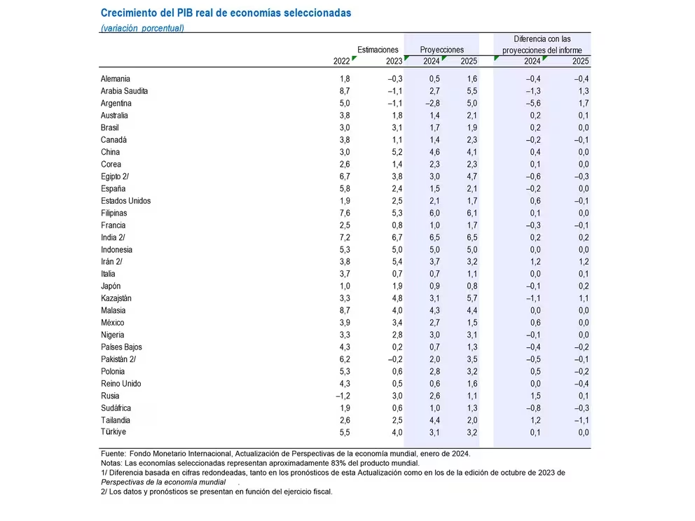 En términos generales, el WEO del Fondo Monetario proyectó que la economía global crecería 3,1% en 2024 y en 3,2% en 2025, lo que supone que las previsiones para 2024 son 0,2 puntos porcentuales superiores al informe de octubre.