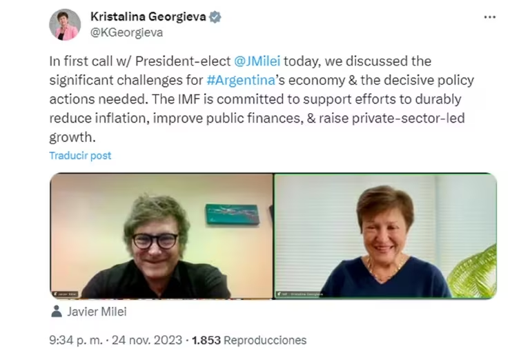 En ese marco, se espera que en las próximas horas el presidente electo Javier Milei tome contacto con funcionarios del Fondo Monetario durante su viaje a los Estados Unidos que comenzó este lunes. Acompañado del ex presidente del BCRA y ex ministro de Finanzas Luis Caputo, Milei iniciará su agenda internacional, se prevé, con reuniones con inversores y funcionarios de organismos internacionales.