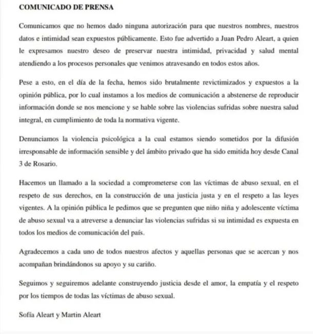 Según aseguraron, Juan Pedro Aleart conocía esta postura de querer “preservar nuestra intimidad, privacidad y salud mental atendiendo a los procesos personales que venimos atravesando en todos estos años» y que, pese a esto, fueron «brutalmente revictimizados y expuestos a la opinión pública».