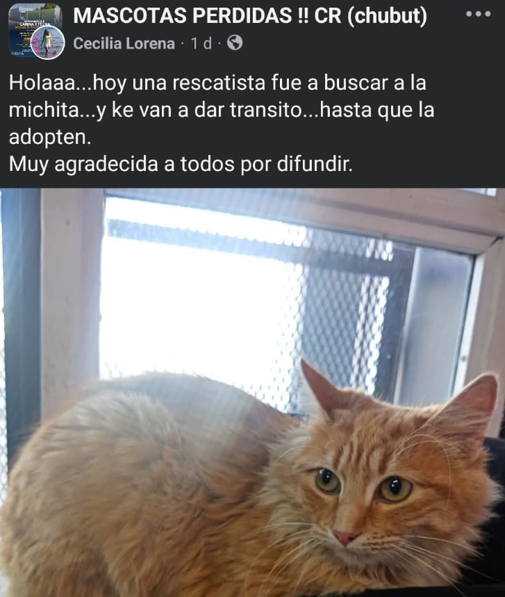 Horas más tarde, una rescatista se ofreció a darle un lugar seguro hasta que pueda ser trasladado a un hogar definitivo. Cecilia, quien inicialmente difundió la situación, expresó: “Muy agradecida a todos por difundir”, concluyó.